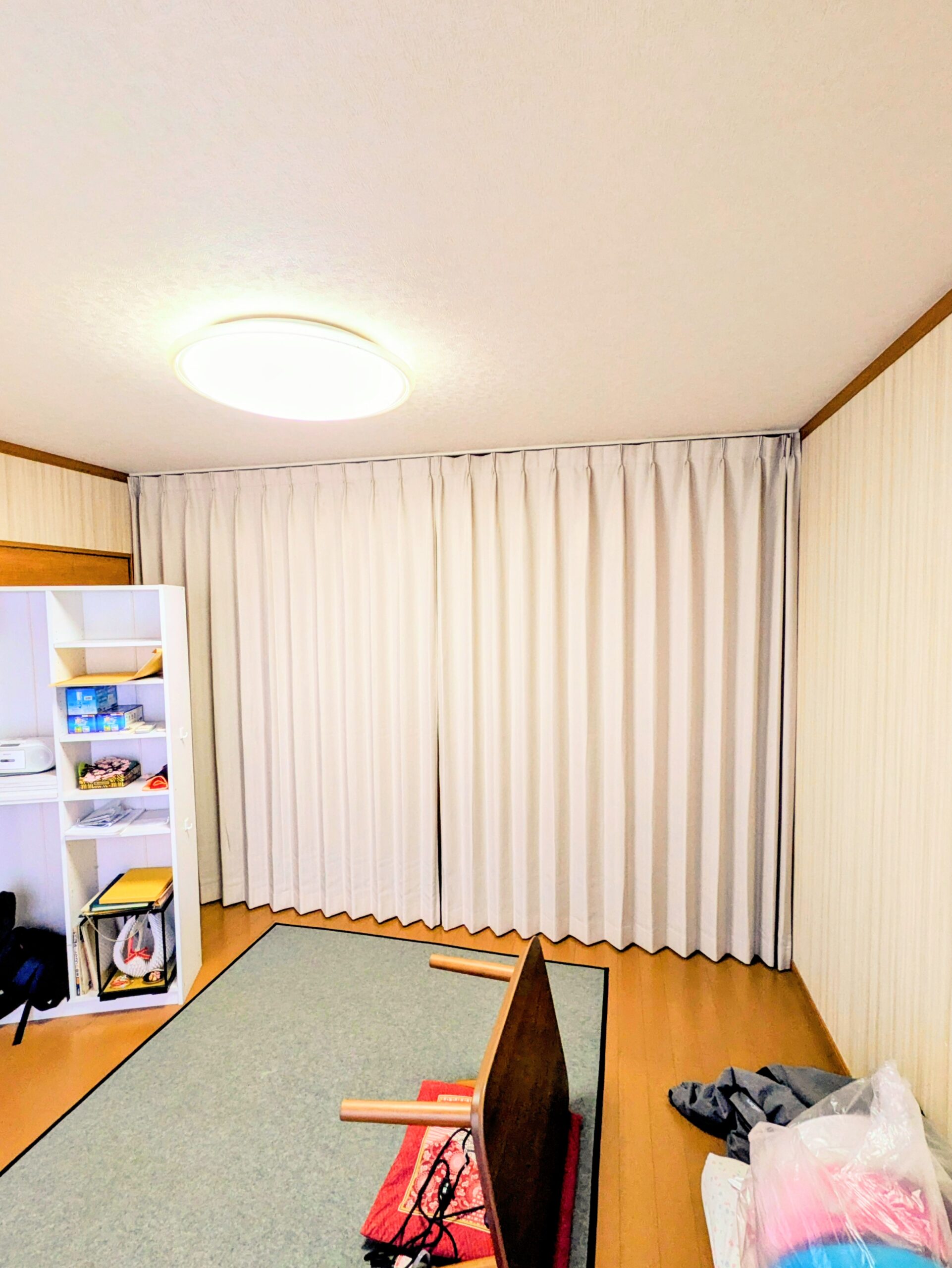 色・柄は部屋に馴染む様にとの事でしたが、窓から遠く照明が無いと暗いので、少し明るめのカーテンを選択。