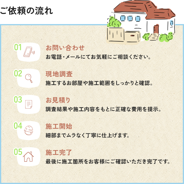 ご予算やご希望をしっかりと伺い、工事内容や費用の内訳を丁寧にご説明。納得いただいたうえで施工を進めてまいります。内装工事に不安を感じる方も、安心してご相談ください。